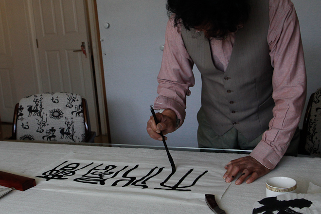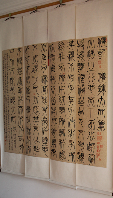 “Solitamente combino forme diverse nelle mie opere, per creare contrasto, ma essendo anche esperto in sigillografia prediligo la forma sigillare Xiaozhuan, che utilizzo sia per le calligrafie che per i sigilli”.