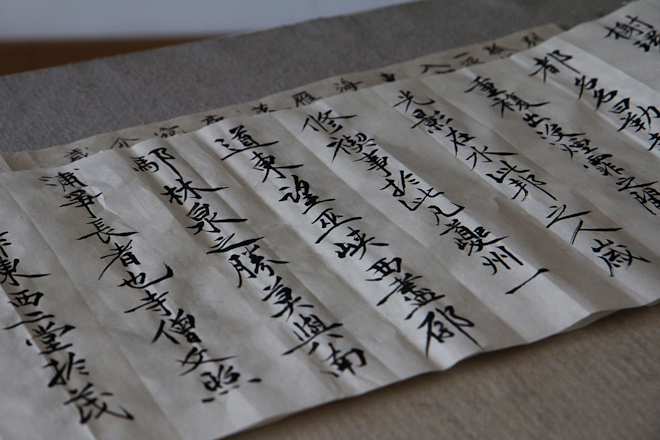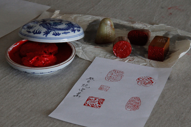 Terminato il pranzo osserviamo Zhongua e Tian Cun cimentarsi con un’esibizione della loro arte, il primo con una calligrafia in forma Zhuan e il secondo con la pittura di un fiore di loto.