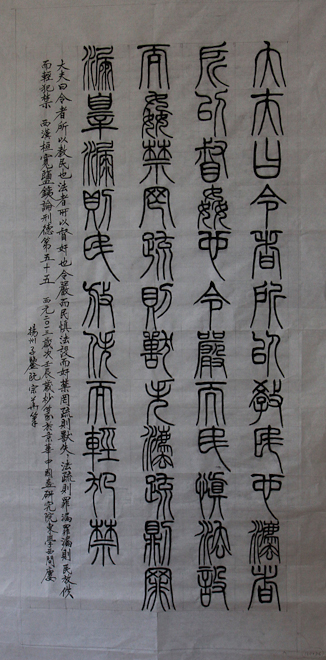 “Ne rimangono cinque fondamentali: la scrittura sigillare (Zhuan), la scrittura dei funzionari (Lishu), la scrittura comune (Kaishu), la scrittura semicorsiva (Xingshu) e la scrittura corsiva (Caoshu). Le forme di scrittura arcaica, ormai inutilizzate, sono incluse nei generi Guwen e Jiaguwen: sono scritte a carattere divinatorio trovate su carapaci e su ossa animali. La scrittura antica evolve nelle forme Jinwen e in seguito Dazhuan, o Zhuan maggiore, incise su metallo, su tavolette di giada e sigilli, dipinte su seta, ceramica e tavolette di bambù. Quando si trattò di stabilire la scrittura ufficiale, l’Imperatore della dinastia Han fece unificare gli stili esistenti, giungendo così allo Zhuan minore o Xiaozhuan”.