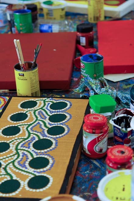 Annette conosce il linguaggio degli aborigeni. Ci spiega che l’aspetto estremamente moderno della grafica aborigena è dovuta alla prospettiva. La visione del territorio è duplice: aerea e a strati. Alcuni elementi sono dunque in sezione, come gli alberi, che si riconoscono dalla sezione circolare del tronco; lo stesso terreno viene sezionato per mostrarne il contenuto. Questo stile è chiamato “a raggi X” ed è affiancato dallo stile “dot art” (a punti). Quest’ultimo, che è attualmente il marchio di fabbrica dell’arte aborigena moderna, nasce nel 1973, quando l’insegnante d’arte Geoffrey Bardon incoraggiò gli aborigeni di Papunya a dipingere le loro storie legate al dreamtime, con lo stile che già utilizzavano per disegnare sulla sabbia. I punti sono equidistanti e di diversi colori. Le opere della dot art appaiono astratte, ma in realtà si avvalgono di un complesso simbolismo in cui a diverse forme base sono assegnati significati ben precisi. I simboli sono immagini stilizzate dell’oggetto in questione, o di una sua orma sulla sabbia, visto dall’alto.