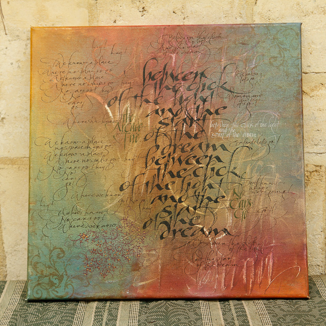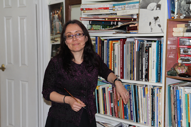 Gaye ci fa accomodare in salotto. Ammiriamo l’arredamento caldo e vissuto, il disordine magico di chi ha dei bambini che scorrazzano per casa. Alle pareti calligrafie rappresentanti poemi epici, imprese cavalleresche e creature mitologiche. Vicino al televisore una torre di giochi da tavolo ispirati a Tolkien e ai Cavalieri della Tavola Rotonda. Gaye arriva col caffè e sorride, vedendo i nostri sguardi catturati da quella che, più che una casa, sembra un’officina-libreria, un complesso studio di registrazione di influenze pittoriche, letterarie ed esoteriche, caratterizzato da un’eleganza quasi vittoriana, l’alcova di una poetessa d’altri tempi.