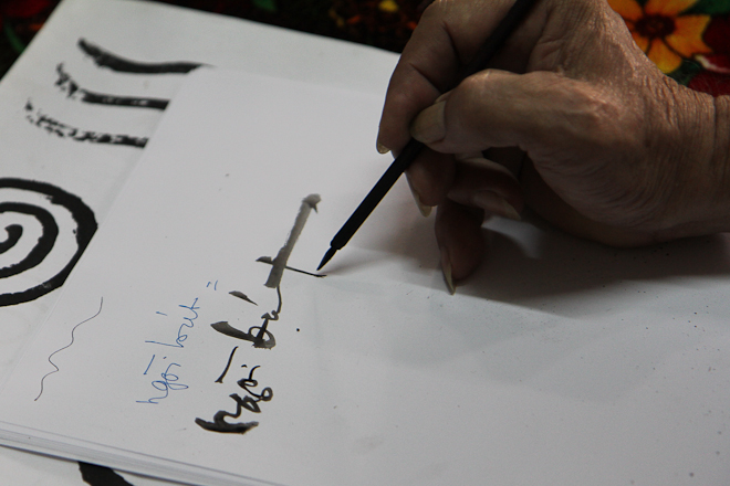 “Il primo maestro è stato mio padre. Mi insegnò a parlare francese e a dipingere. Oggi ho sessantanove anni e da quando ne ho dieci dipingo. Era importante per lui che io imparassi entrambe le cose. All’epoca non capivo perché. Quando in seguito scelsi la strada della calligrafia, nel’99, imparai a combinare quello che avevo appreso da mio padre, le tecniche di pittura, alle lettere”.