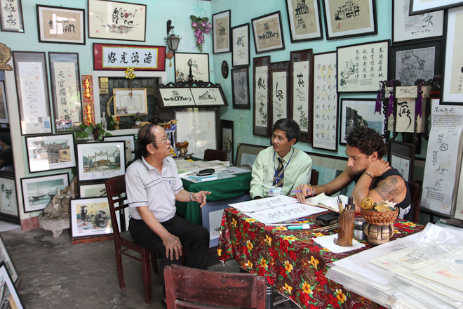 Dopo aver intervistato Pham Thuc Hong, calligrafo vietnamita dal background classico, la nostra guida, Mr. Truong, ci conduce attraverso vicoli gocciolanti, cortili festosi, ponticelli in legno, strade gremite di turisti fino alla piccola bottega di Do Minh Nhan.