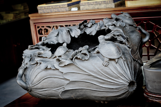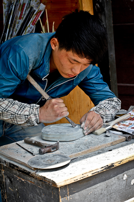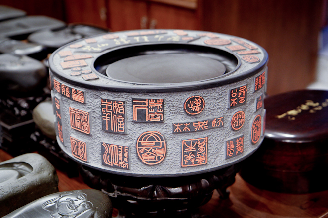 Durante il nostro pellegrinaggio nelle botteghe di Tunxi esaminiamo alcuni calamai, il cui prezzo è a dir poco esorbitante. Gli artigiani ci spiegano che i più costosi testimoniano l’abilità dell’artista nello sfruttare i disegni e i colori naturali della pietra per scolpirne temi e figure sulla superficie.