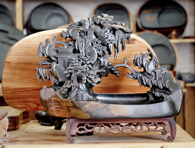 “Innanzitutto scegliamo la pietra da lavorare, poi ci focalizziamo sui motivi decorativi, lo stile, la lucidatura e la creazione di un contenitore adatto. Possiamo distinguere più di 100 tipi diversi di pietra, suddivisi a loro volta in cinque grandi categorie che variano in base alla grana. Le sculture che ne caratterizzano le forme si suddividono in tre generi: Anhui, Guangdong e Jiangsu”.