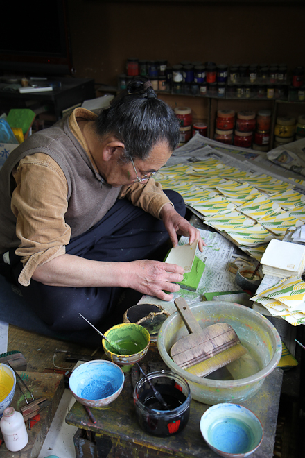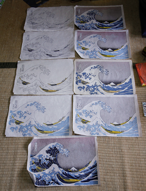 - Per ogni colore ci vuole una nuova tavola di legno, quindi si colora a mano la stampa ottenuta dalla lastra principale, la si incolla sulla lastra nuova, si toglie la carta in eccesso, si intaglia la parte del colore e si marcano i segni di registro. Questo procedimento viene svolto per ogni colore.