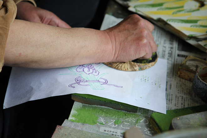 di creazione delle xilografie, ognuno specializzato nella propria disciplina. Il disegnatore, l’artista, disegna l’opera ad inchiostro. L’assistente, chiamato hikko, riporta il tracciato mastro. L’incisore incolla il foglio mastro a faccia in giù (in modo da specchiare il disegno per poi averlo dritto in fase di stampa) sulla tavola di legno e scava le parti bianche, lasciando in rilievo quelle che poi verranno stampate. Lo stampatore inchiostra le tavole e procede alla stampa.