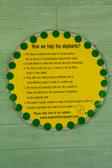 Dopo lo spettacolo ci spostiamo verso la zona in cui si lavorano gli escrementi. C’è solo un artigiano che gestisce un piccolo negozio. Gli chiediamo della produzione di carta e l’uomo ci spiega che la carta viene effettivamente ricavata dagli escrementi, ma l’uso è destinato unicamente alla produzione di alcuni oggetti d’artigianato e souvenir. Questo perché la qualità non è elevata. Nessuna scoperta rivoluzionaria, dunque. Toccherà continuare ad abbattere foreste per garantirci il sano vecchio libro davanti al camino e il quotidiano a colazione. Ad ogni modo lo scopo per il quale viene prodotta la carta con la cacca di elefante è tutt’altro che inutile. Il centro sfrutta la risorsa gratuita per confezionare prodotti artigianali ricavandone un’entrata che serve al finanziamento dell’ospedale. Anche gli spettacoli servono a raccogliere fondi per curare gli elefanti malati e gestire il centro.