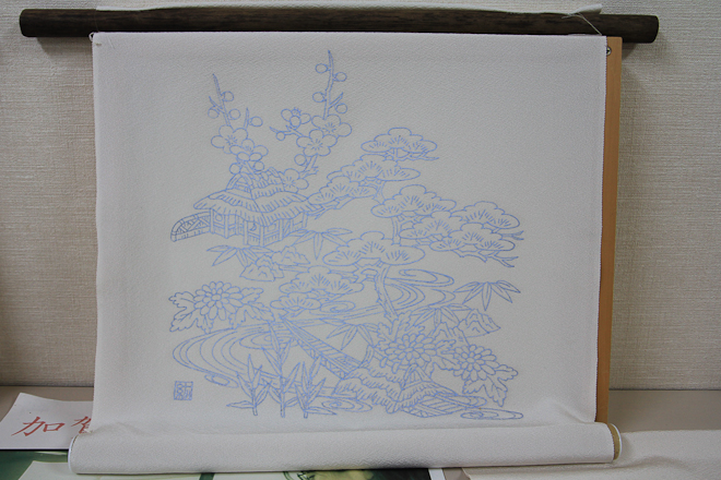 Il motivo ornamentale viene disegnato dapprima sul foglio. - Trasferimento del disegno sul kimono
