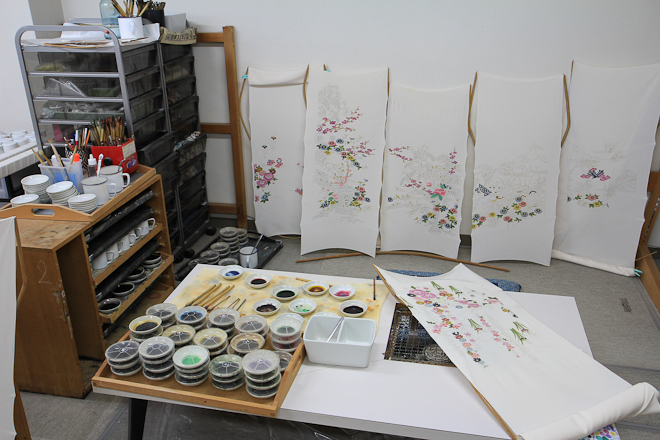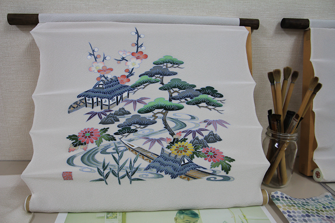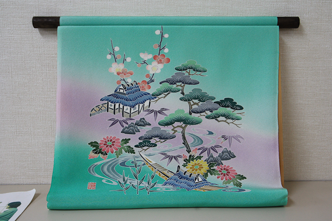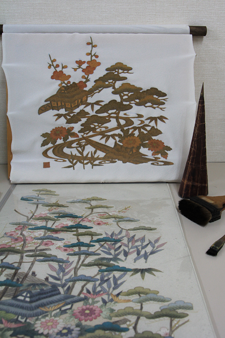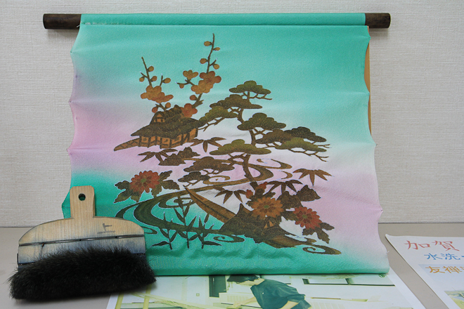 Il disegno viene colorato usando un fine pennello. Nella tecnica Kaga Yuzen si prediligono colori delicati e profondi alle tonalità accese. Questi verranno poi sfumati dall’artista. I colori utilizzati sono artificiali. - Impermeabilizzare con la pasta