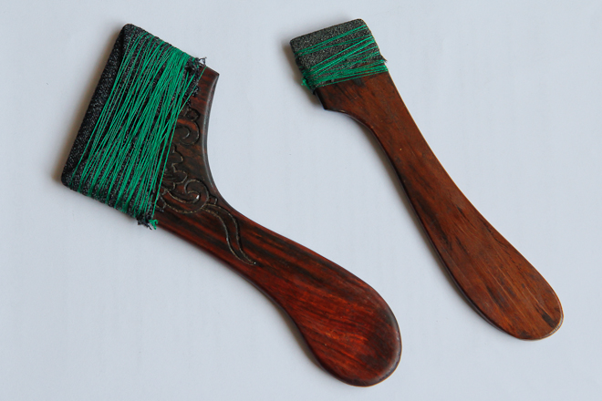 “In Cina la calligrafia araba si praticava utilizzando gli strumenti cinesi, quindi il pennello, l’inchiostro nero e la carta di riso. La calligrafia araba tradizionale predilige invece l’uso del calamo. Avendo praticato calligrafia per trent’anni, ho imparato a crearmi gli strumenti da me, come fanno d’altronde molti calligrafi. Il calamo tradizionale non ha molto serbatoio, non è adatto sulla carta di riso e per le calligrafie di grandi dimensioni l’impugnatura della penna è diversa. Così ora mi scolpisco questi strumenti ai quali aggiungo della stoffa sulla punta. In questo modo il tessuto assorbe più inchiostro e posso scrivere più a lungo”.