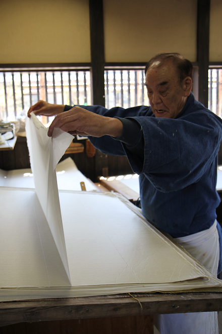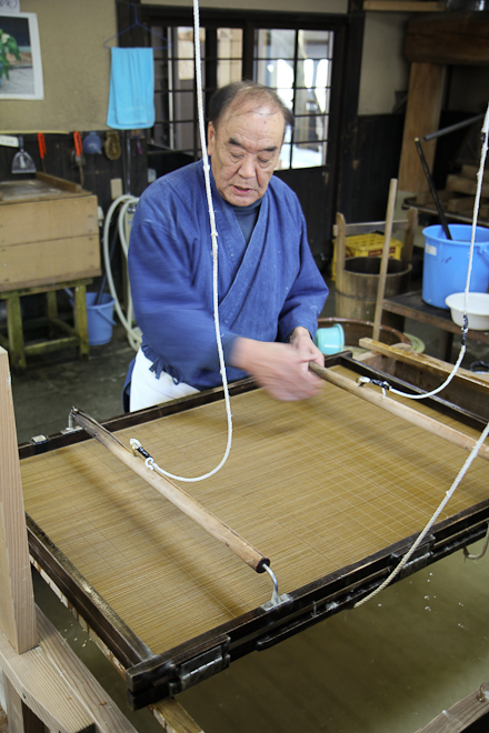 Solo al termine nascono i fogli: il telaio di legno, sul quale è sovrapposto una lastra flessibile di bambù, è immerso nella vasca e, con un’abile tecnica di oscillazione, l’artigiano pesca la poltiglia e la spande su tutto il telaio. Appena l’acqua cola può togliere la stuoia e impilarlo, dalla parte poltigliosa, suglialtr i fogli. A fine giornata la pila di carta viene pressata per tutta la notte, in modo da eliminare l’acqua in eccesso. L’indomani i fogli vengono separati e fatti asciugare sui pannelli di legno per un’ora e mezza circa.