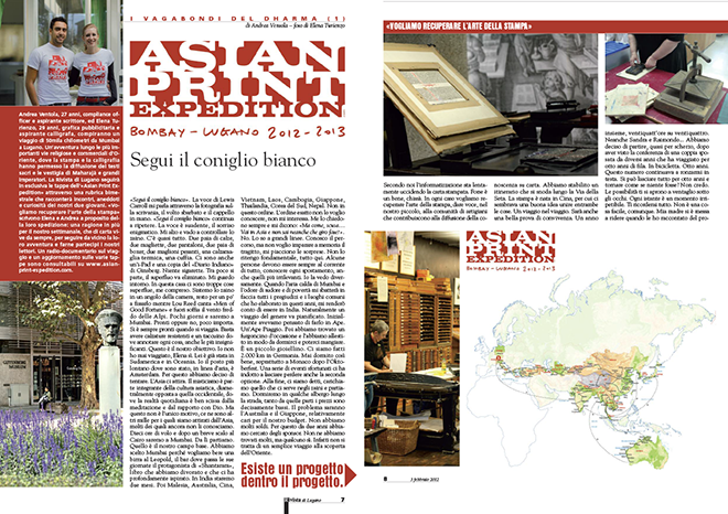 «Mi laureo e parto per un breve soggiorno linguistico all’estero». Quando le ho detto che l’India era la prima tappa mi ha guardato senza dire niente. Aveva un grosso punto di domanda disegnato in fronte. Non ci credeva. In realtà non ci credevo neanch’io. Pensavo che non ce l’avremmo mai fatta a raccogliere tutti i soldi che ci servivano, ma basta ridimensionare le proprie esigenze e una soluzione si trova. Inizialmente l’idea era di raccogliere 100mila franchi (inclusi gli acquisti pre partenza). Non l’ho mai detto a Elena, ma se avessimo raccolto una cifra simile non sarei mai partito. L’unico Taj Mahal che avrei visto sarebbe stato quello di Las Vegas, con le torri di fiches che ti coprono la visuale e fiumi di gin tonic. Ovviamente non siamo riusciti a raccoglierli. Così abbiamo più che dimezzato. Sono circa trenta franchi a testa al giorno. In posti come l’India, il Vietnam o la Thailandia ci vivi alla stragrande. Il problema saranno il Giappone e l’Australia, ma per il momento non ci pensiamo. L’importante è partire. È l’unica cosa che conta, ormai. Abbiamo speso molto in questo progetto. Elena è stata l’organizzatrice principale. È lei che ha fatto il lavoro sporco. Cercare sponsor, preoccuparsi della pianificazione, elaborare le t-shirt dell’«Asian Print Expedition», organizzare le paellate e le aste per raccogliere i fondi. Molte persone ci hanno dato una mano non indifferente. Ognuno dei nostri amici, dei nostri familiari, ha contribuito poggiando ciascuno il proprio mattone. Una squadra come non ne vedevo da tempo.